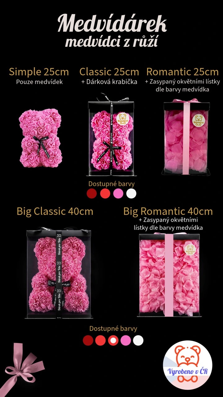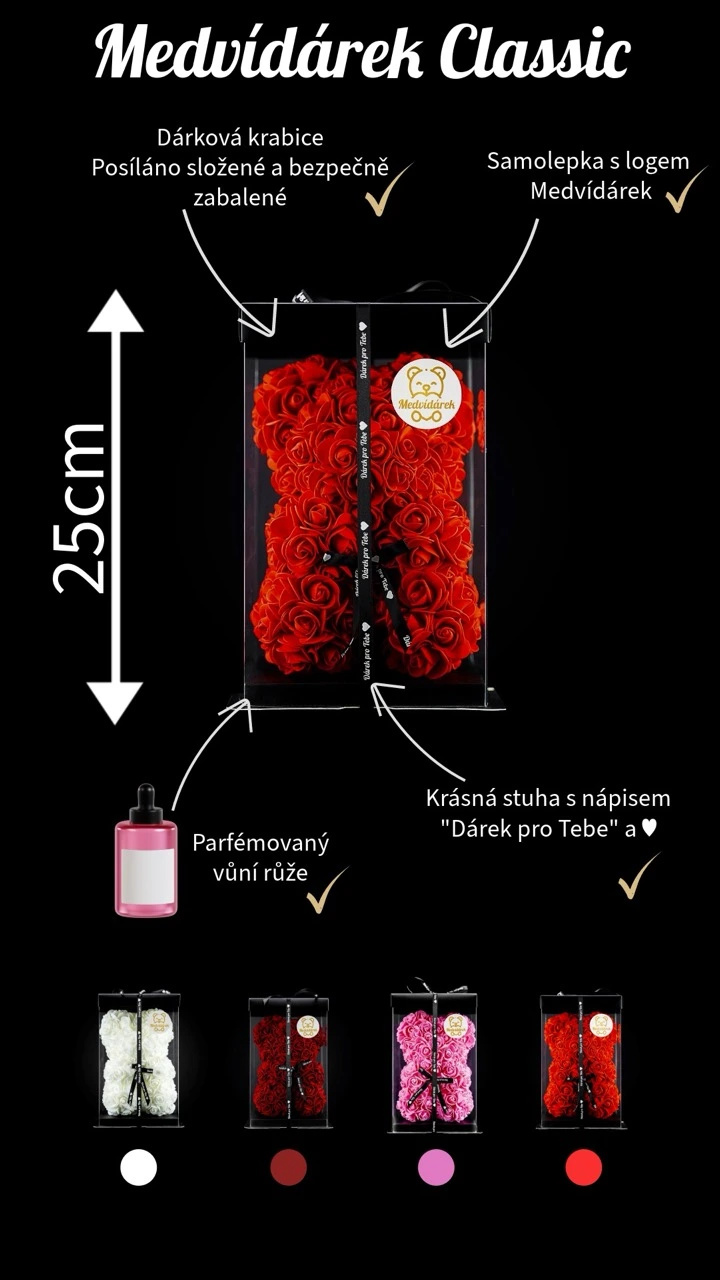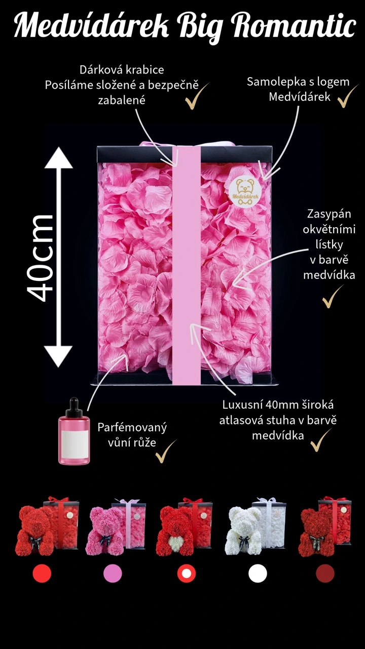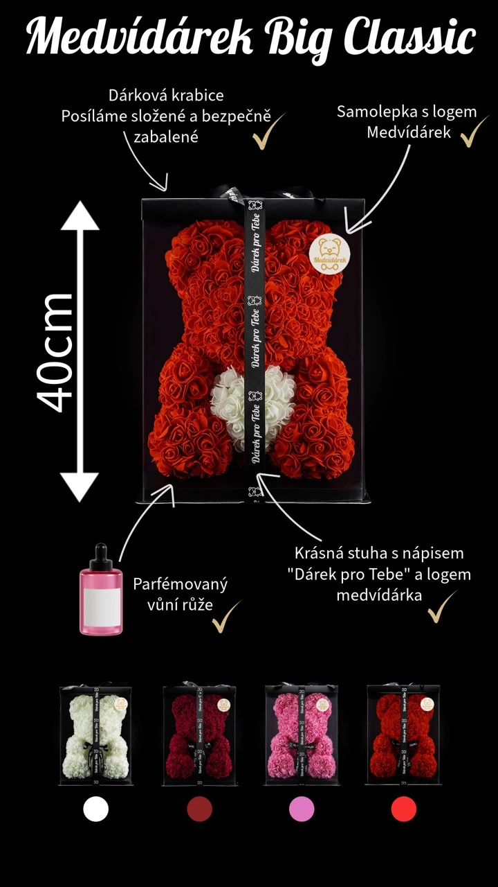 MEDVÍDÁREK BIG Classic je veľký parfumovaný medveď z ruží s veľkosťou 40 cm. Medvedík z ružičiek je ideálny darček pre ženu na Valentína, narodeniny alebo ako svadobná dekorácia.