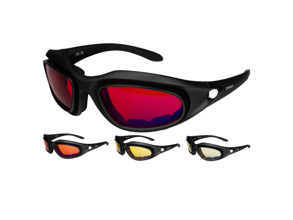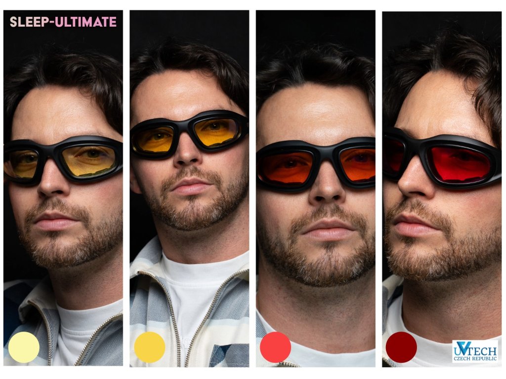 UVtech SLEEP-Ultimate sú najlepšie okuliare pre hygienu spánku v našej ponuke. 4 vymeniteľné farebné šošovky, ergonomický dizajn, luxusné balenie, vrecko a handrička z mikrovlákna a pásik pre bezpečné uchytenie na hlave počas športovania.